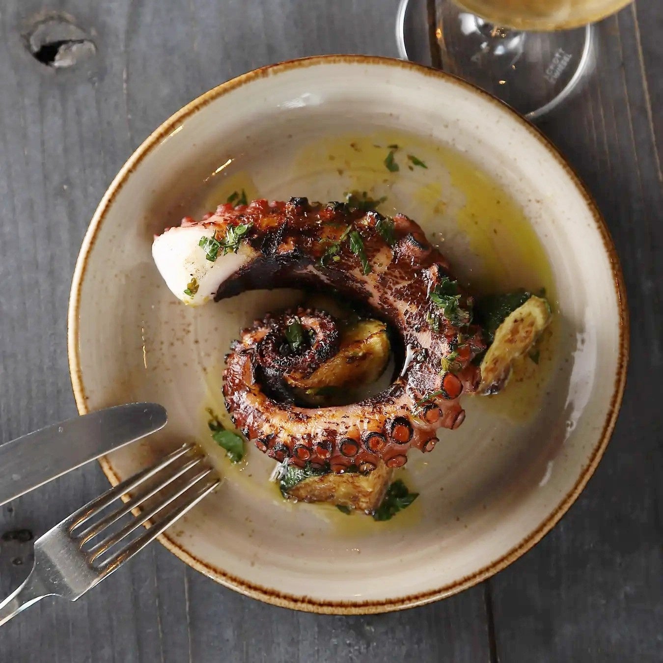 香ばしく焼き上げたズッキーニとプリっとした食感のタコに、爽やかなレモンソースを添えて。軽やかで夏らしい前菜です。