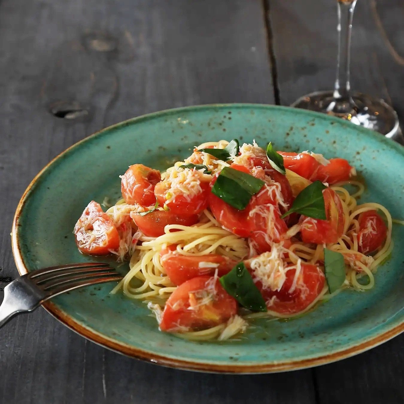 フルーツトマトとズワイ蟹、水牛モッツァレラの冷製パスタ フェデリーニ