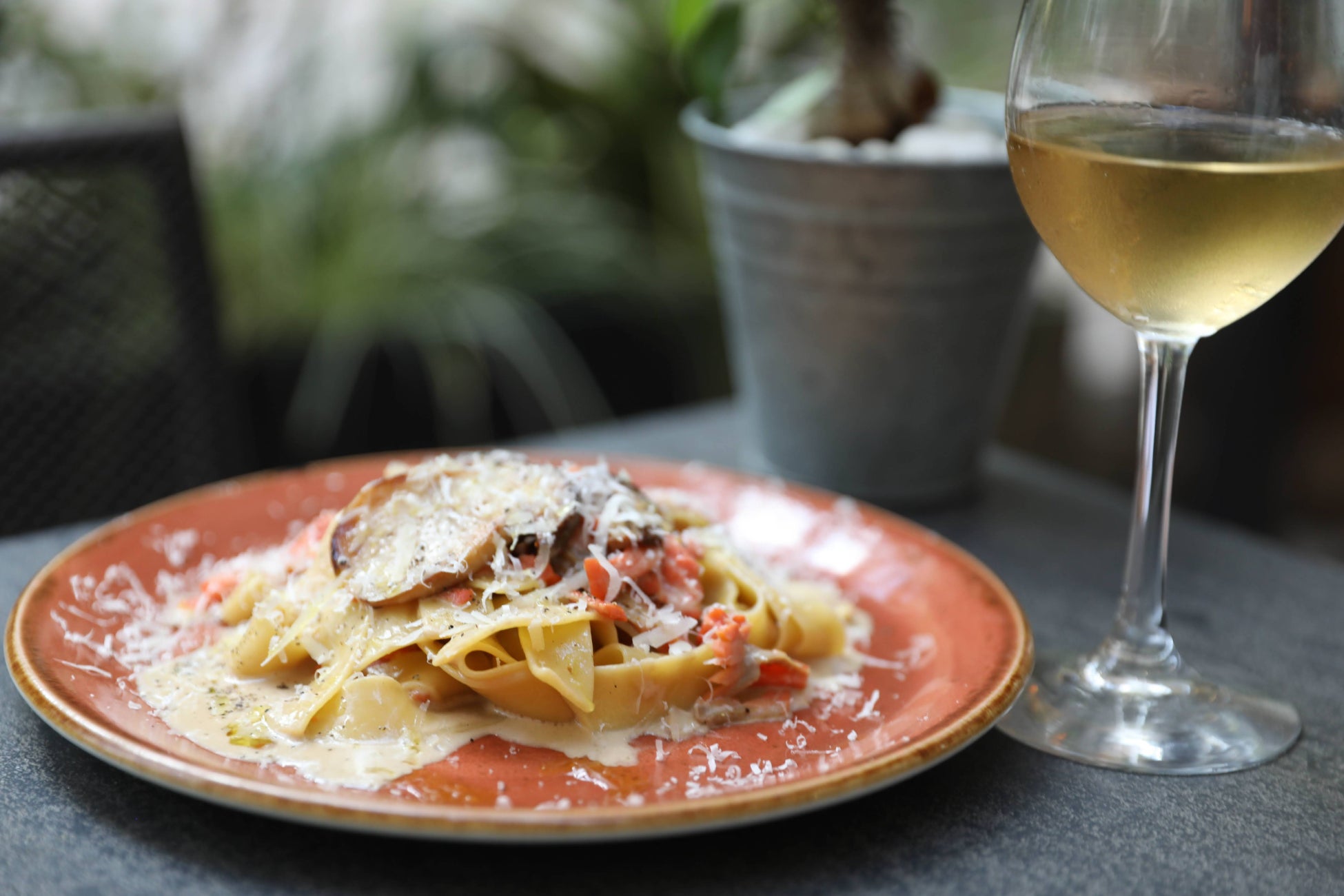 ~旬のイタリア産ポルチーニ茸とスモークしたサーモンのクリームソースを平打パスタのパッパルデッレで~