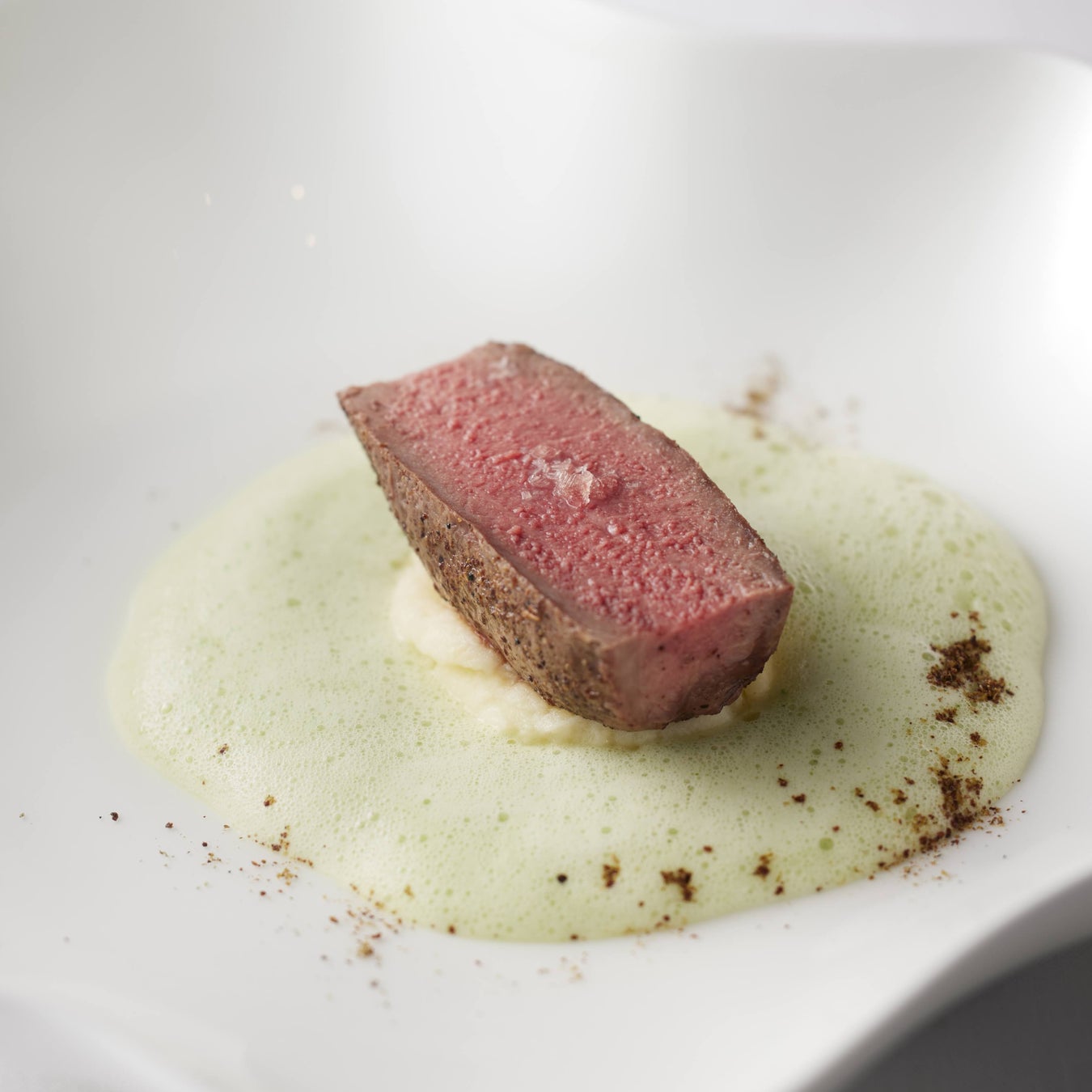 本メニューは、世界的シェフ ジャン・ジョルジュ・ヴォンゲリスティンの哲学を受け継ぐ東京店のシェフ 望月 良一が、旬の素材と繊細な感性を融合させて構築した全10皿のコースです。前菜には、メロンとラズベリー、ヨーグルト、しそを合わせた爽やかな一皿や、香ばしく焼き上げたクリスピー寿司に信州サーモンとチポートレマヨネーズを添えた、ジャン・ジョルジュらしい遊び心あふれる料理が登場。メインディッシュには、オーストラリア産の仔羊に枝豆とプリザーブドレモンを合わせた、力強さと爽やかさを兼ね備えた一皿をご用意しました。
