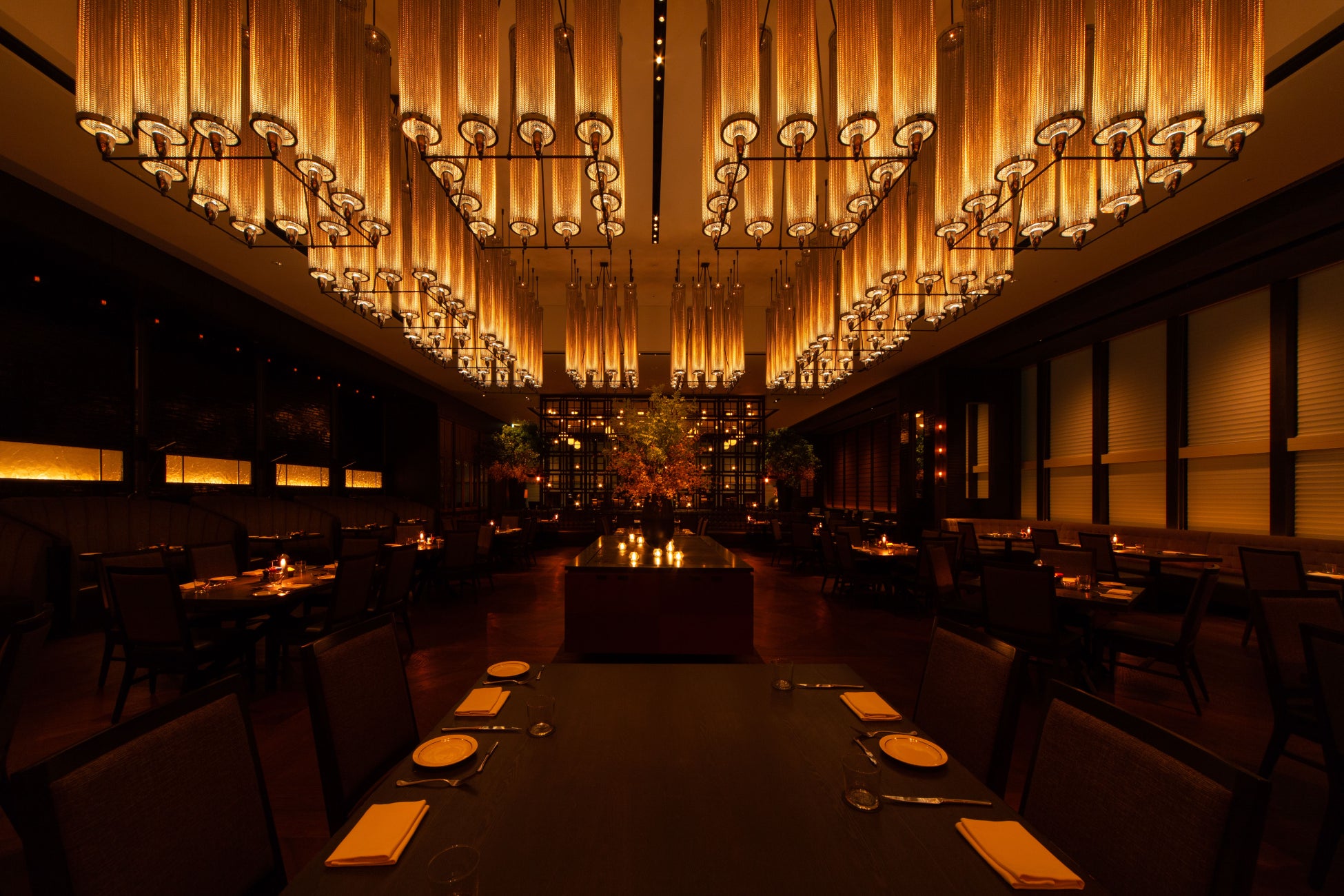 国際的なビジネスエリアにある赤坂店は、ビジネスエリートの会食にもそぐうよう都会的で洗練されたインテリアをテーマにしています。天井高が5mある220席のメインダイニングの中央には、ペンダントタイプの象徴的なシャンデリアが配置され、大ぶりのプランツデコレーションと共にダイナミックな空間を創出しています。シャンデリアの照度調整と卓上のキャンドルは、各テーブルにエレガントな雰囲気を演出しています。